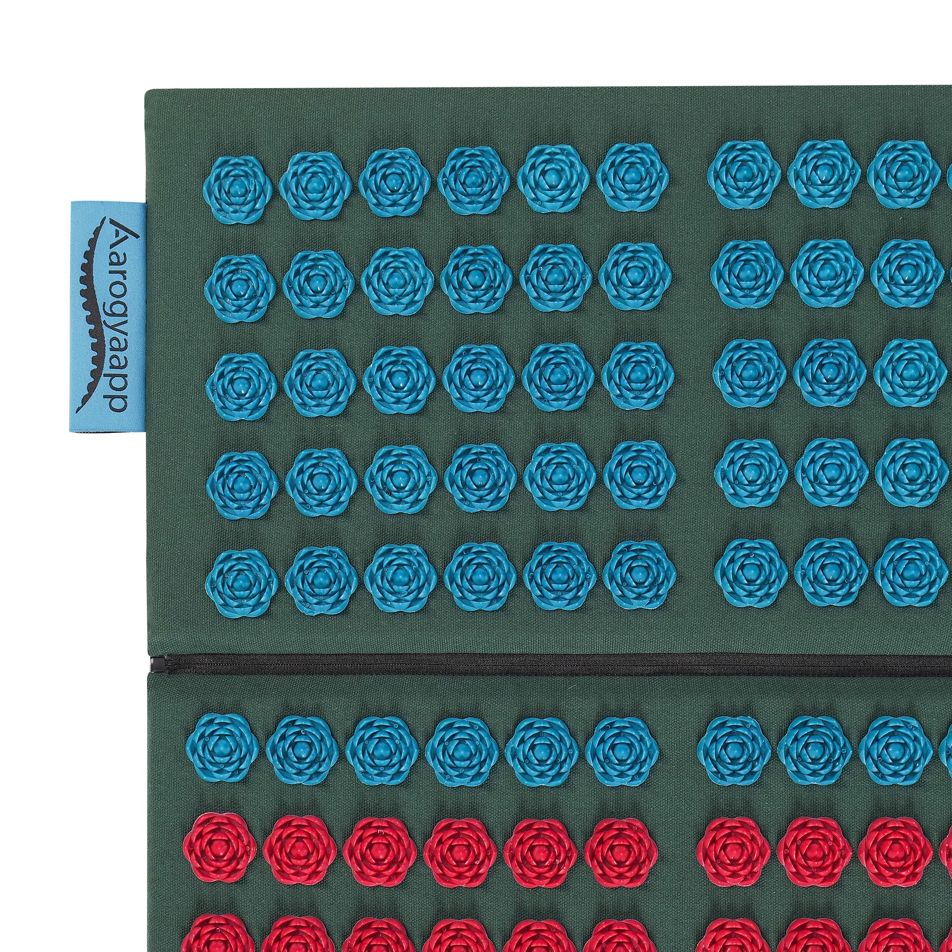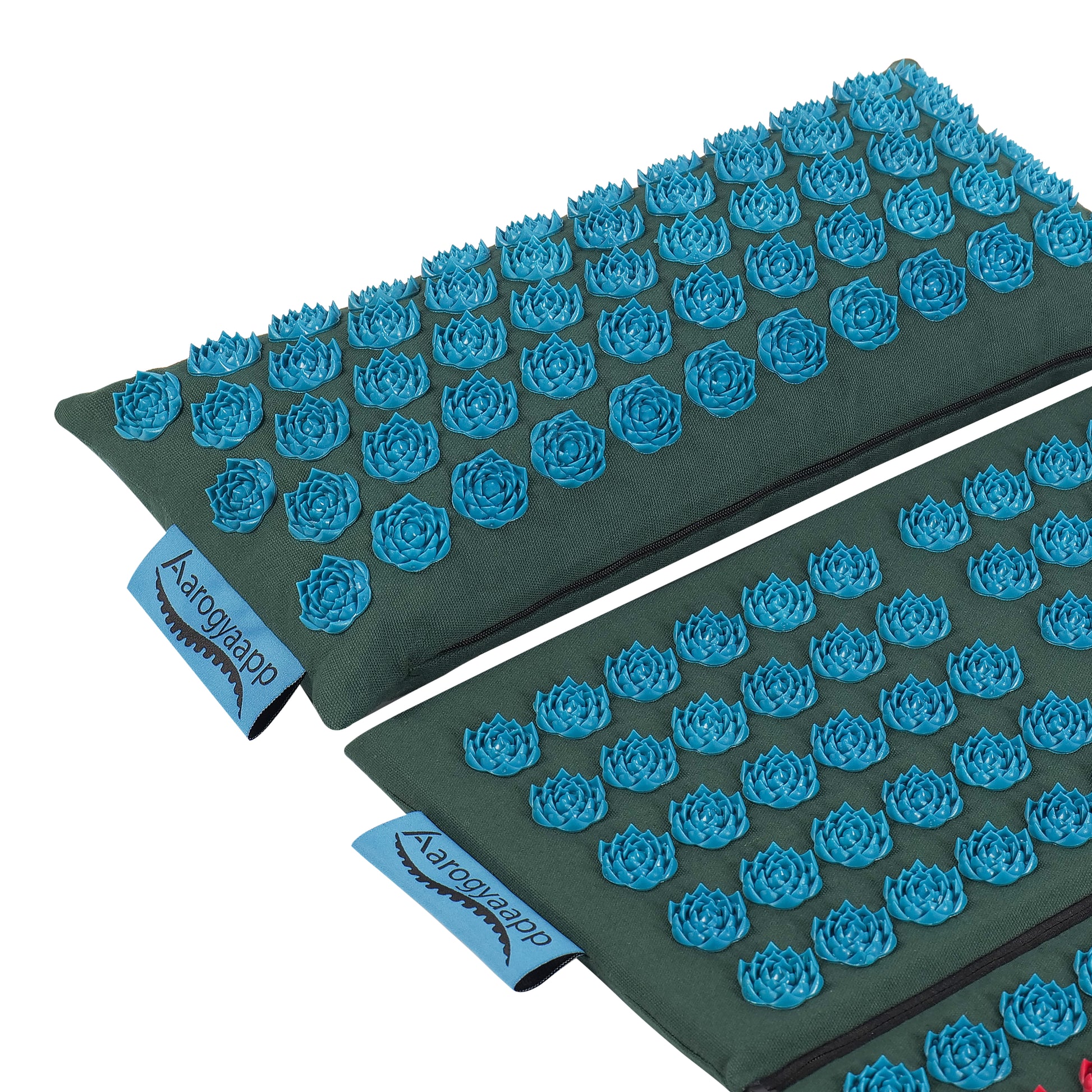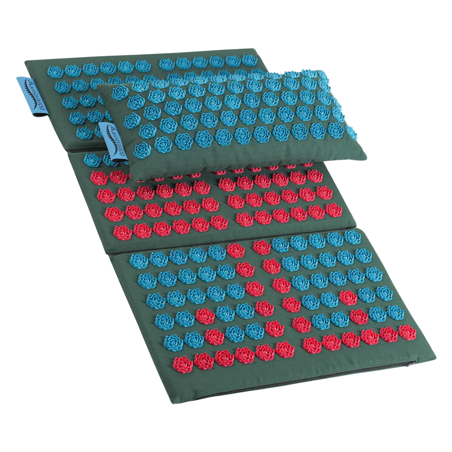 Experience deep, natural healing with our Premium Forest Green Acupressure Mat & Pillow Set with Teal Blue & Red Lotus Points, designed to activate vital pressure zones across your back, neck, and body. The multi-colour lotus-shaped acupressure nodes are scientifically arranged to stimulate nerve endings, improve circulation, and release muscle tension naturally.